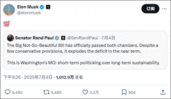 而马斯克本人则早在7月1日便在社交平台上将该法案称为“债务奴役法案”,并公开质疑特朗普的财政政策方向。