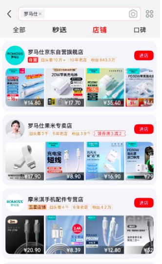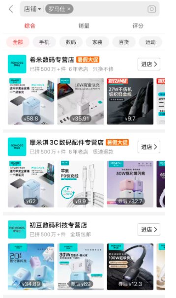 图片来自淘宝APP京东平台只剩下罗马仕京东自营旗舰店(京东自营旗舰店是京东平台中由京东官方直接运营的店铺);拼多多平台也搜索不到罗马仕店铺,和淘宝一样,有罗马仕充电线、数据线等产品在其他店铺售卖。