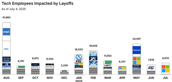 下面这张图表,总结了从2024年8月到2025年7月,全美科技行业被裁掉的人数。