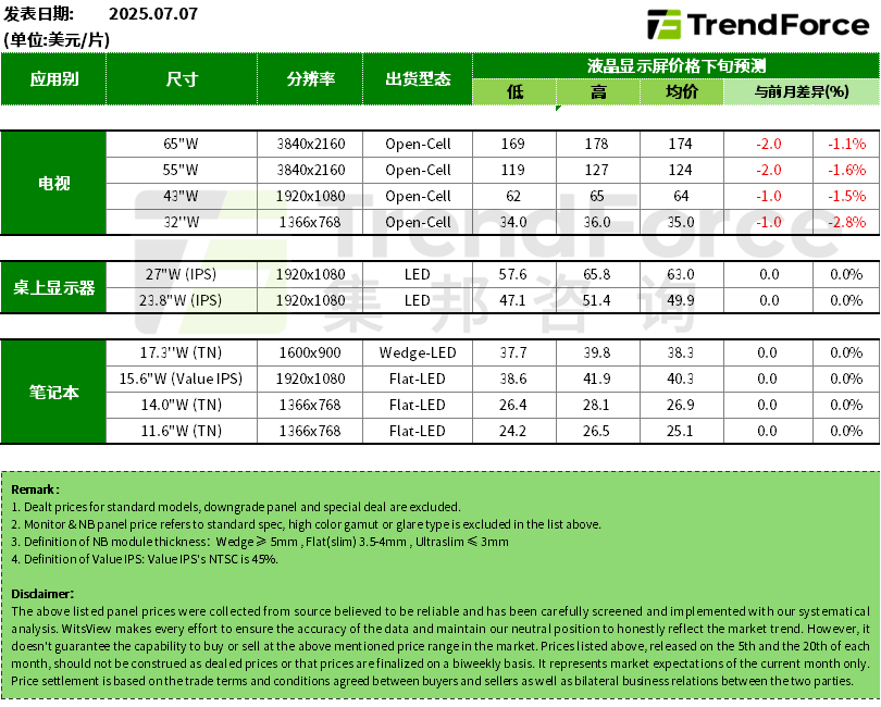 智通财经APP获悉,近日,TrendForce集邦咨询公布了7月面板价格趋势预测:2025年7月,电视面板价格继续下探,显示器与笔记本价格仍持平。进入7月份,电视面板需求依旧疲软,部分品牌客户继续修正第三季的采购订单,在控制库存的同时,也增加与面板厂议价的筹码。就面板厂而言,按需生产的节奏依然持续,但在整体需求放缓的背景下,部分面板厂的确会考虑接受品牌的要求,导致面板价格开始出现小幅走跌的状况。进入第三季后,显示器(MNT)面板需求也开始出现放缓迹象,仅有少部分尺寸规格在供应上仍小有缺口。