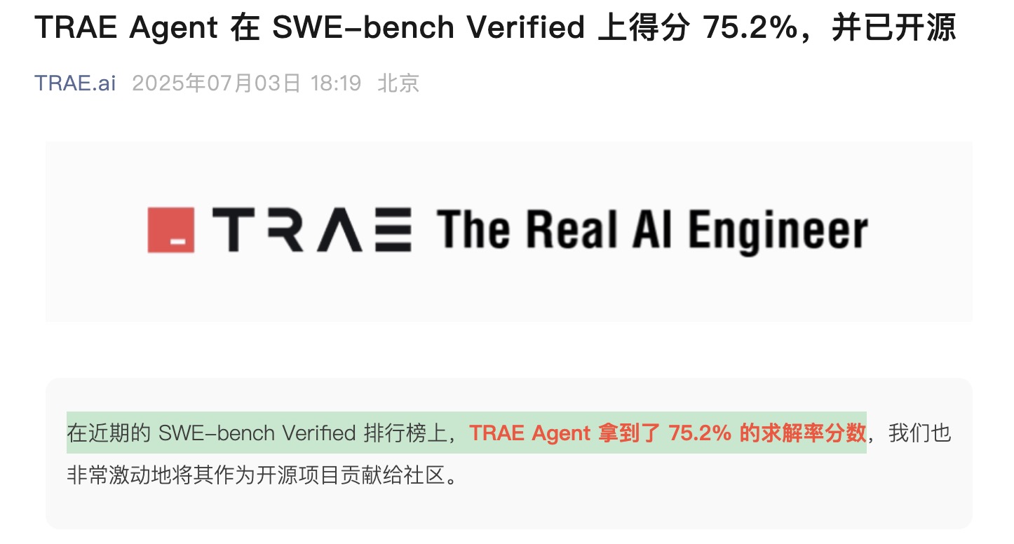 “TRAE的目标是AI Development,而不仅是AI Coding。”洪定坤在6月的火山引擎Force大会上直言。在近期的SWE-bench Verified排行榜上,TRAE Agent已拿到了75.2%的求解率分数。