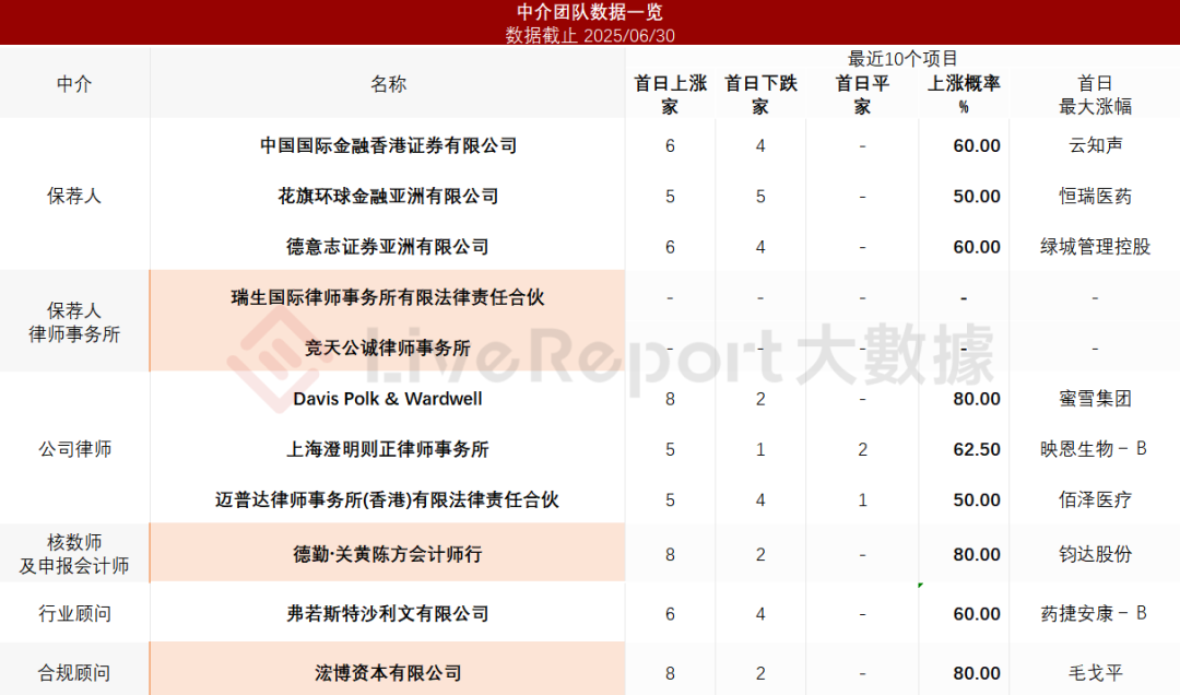 据LiveReport大数据统计,镁佳股份中介团队共计11家,其中保荐人3家,近10家保荐项目数据表现整体不尽如意;公司律师3家,综合项目数据整体一般。整体而言中介团队历史数据表现一般。