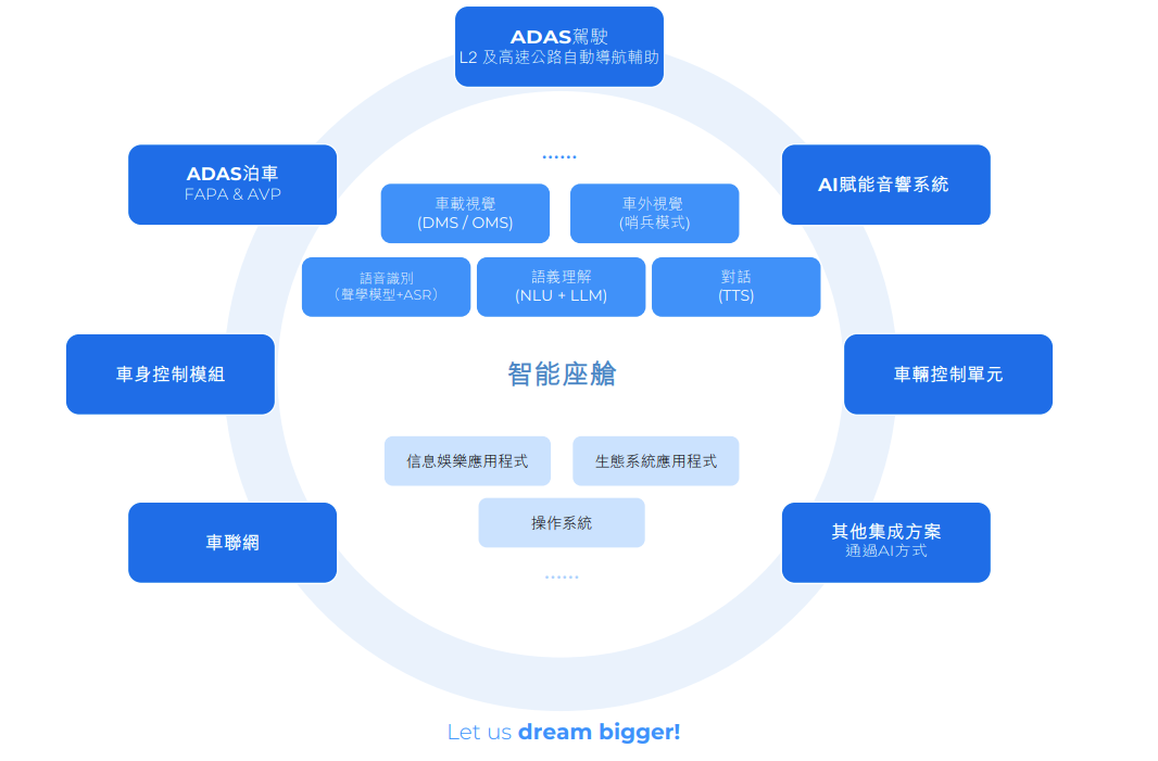 核心:智能座舱-镁佳股份的智能座舱如同车辆的数字大脑,无缝融合软件和硬件,带来强大便利的体验。其整合多项AI驱动功能,包括车内视觉功能(如DMS/OMS)、车外视觉功能(例如哨兵模式)、 声学自动语音识别(ASR),以及基于自然语言理解(NLU)与大型语言模型(LLM)的先进语义理解能力。