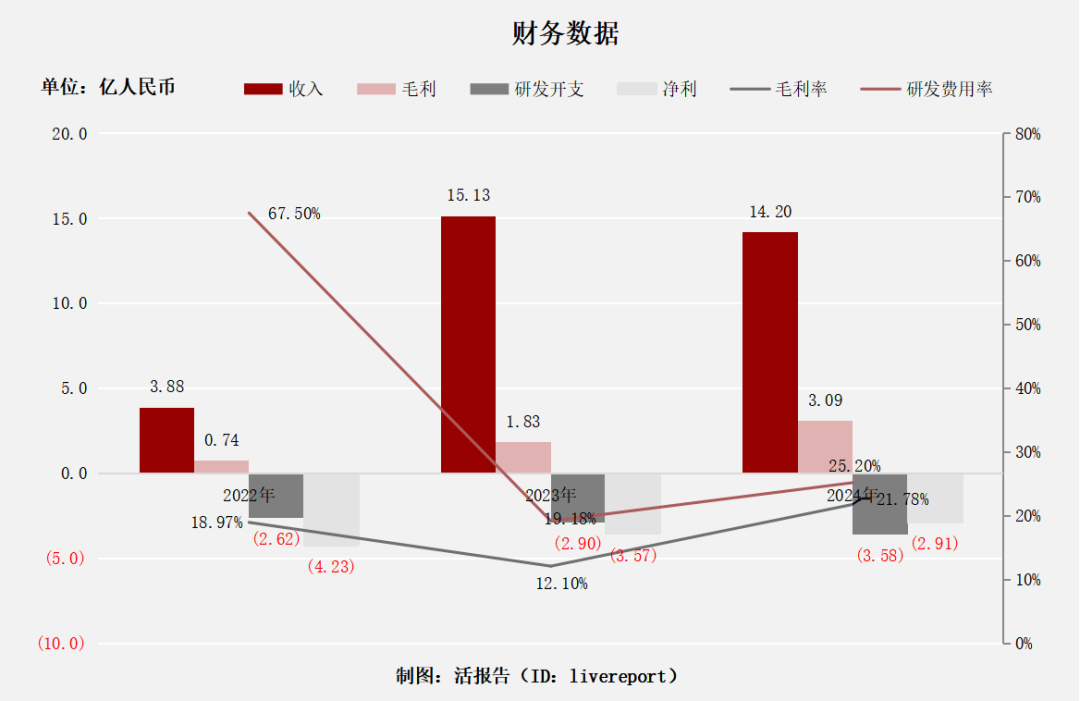 该公司2022-2024年的财务表现:收入呈现先增后降趋势,但毛利率经历V型反转,显示盈利能力有略微改善。值得注意的是,研发费用率虽从2022年畸高的67.50%大幅下降,但仍维持在20%左右的高位(2024年为25.20%),反映出公司仍处于扩张阶段。