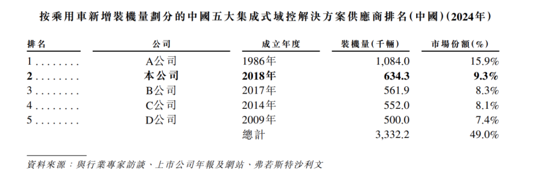 集成式域控解决方案行业目前呈现相对分散的态势。2024年,中国前五大集成式域控解决方案供应商共占据49.0%的市场份额,其中搭载本公司集成式域控解决方案的车辆在中国总销量达63.4万辆,以约9.3%的市占率位居全国第二。值得关注的是,本公司位列前五强中最年轻的企业,在相对短暂的时间内实现了快速成长与市场认可,彰显在这个快速演变产业中的强劲创新能力与竞争优势。
