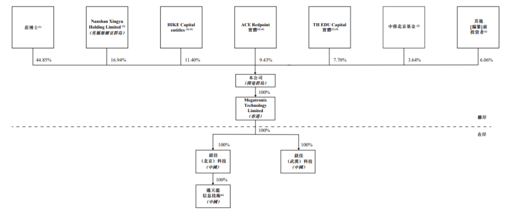 IPO前,镁佳股份在上市前的股东架构中,主要控股股东庄莉博士持股约44.85%;Nanshan Xingyu Holding Limited (英属维尔京群岛)持股约16.94%;实体包括HIKE Capital L.P.及HIKE Capital III L.P. 的HIKE Capital entitles 持股约11.40%;实体包括ACE Redpoint Ventures China I, L.P.、ACE Redpoint Associates China I, L.P.、ACE Redpoint China Strategic I, L.P.、ACE Redpoint Opportunity China, L.P.及ACE Redpoint Opportunity Associates China, L.P. 的ACE Redpoint持股约9.43%;TH EDU Capital(实体包括苏州慕华股权投资合伙企业(有限合伙)、TH EDU Capital Fund I LP及安徽慕华一号股权投资合伙企业(有限合伙))持股约7.70%;中移北京基金持股约3.64%;其他上市前投资者持股约6.06%。