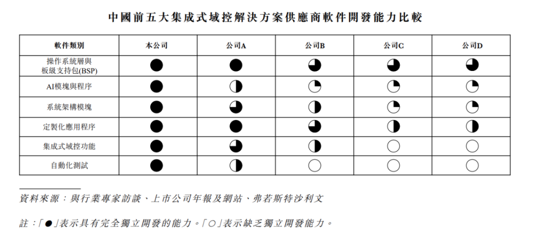 在中国前五大集成式域控解决方案供应商中,公司凭借独特优势脱颖而出,成为业内唯一具备全栈自主研发能力的供应商,不仅能独立开发域控相关软件、自主设计硬件,更能将软硬件无缝融合,提供端到端的完整解决方案。此全面性技术布局使公司得以打造高度定制化的整合型产品,精准满足汽车行业不断演进的需求,从而奠定差异化竞争优势。