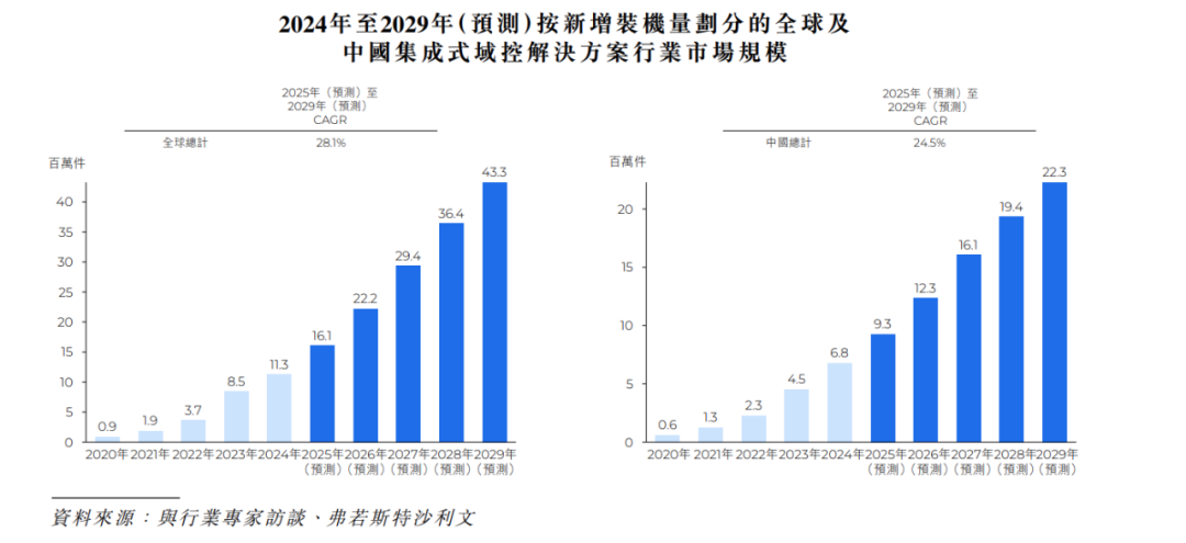根据弗若斯特沙利文(Frost & Sullivan)的资料,全球新增装机量从2020年的0.9百万件增至2024年的11.3百万件,预计到2029年将达到约43.3百万件。在中国,新增装机量从2020年的0.6百万件增至2024年的6.8百万件,预计到2029年将达到22.3百万件。尽管早期的应用主要集中在高端汽车市场,但该技术正快速迈向大众市场。 2024年,集成式域控解决方案在价格低于人民币100,000元以及在人民币100,000元至人民币 200,000元之间的乘用车渗透率分别为1%及19%。预计到2029年,该等比率将分别上升至15% 及60%。