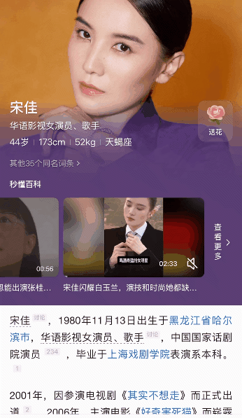 以前都是以文字为主,出生日期、生平履历、作品列表等简历式陈列。而宋佳的百科里这个页面有点像翻开了给她定制的一本时尚杂志,或者说是微型纪录片【从白玉兰双冠到联合国倡导者】有图有视频,刷起来比短视频还上头。