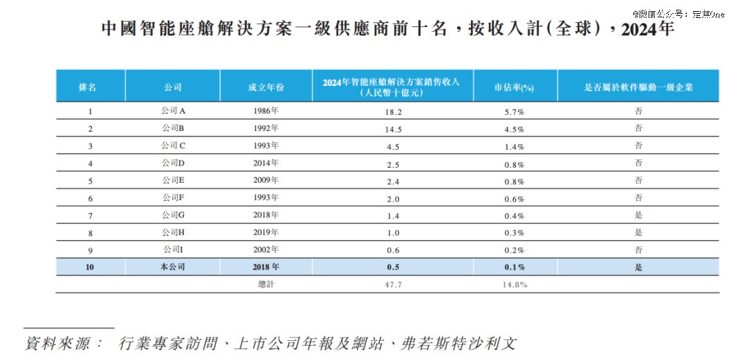 2024年,四维智联在1300亿元的智能座舱市场中,只分到0.1%的份额,行业前三(市占率分别为5.7%、4.5%、1.4%)的体量是它的十几倍甚至将近60倍。