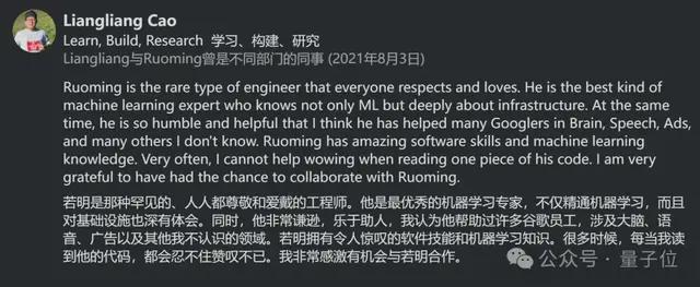 从谷歌Gemini主管Liangliang Cao(苹果前首席科学家)对他的评价来看,庞若鸣不仅精通机器学习,更重要的是还懂基础设施。