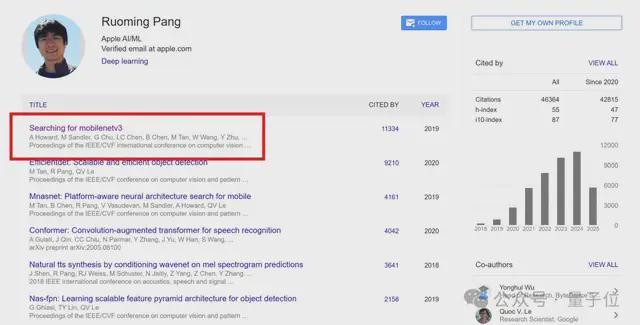 谷歌学术页面显示,其论文总引用量高达4w+,最高的一篇正是在苹果期间提出的新一代轻量化神经网络模型MobileNetV3。