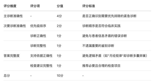 训练数据集过度集中在常见病,导致模型对罕见病识别能力不足。为此,我们采用平衡采样策略,对罕见病例进行针对性采样,确保各类疾病都能获得足够的训练样本。在评测标准方面,人工评测存在主观性强、标准不统一的问题,我们引入另一个大模型作为标准化评测工具,有效保证了评分的客观性和一致性。这些措施共同构成了一个完整的质量保障体系,为专业领域模型的开发提供了可靠支撑。