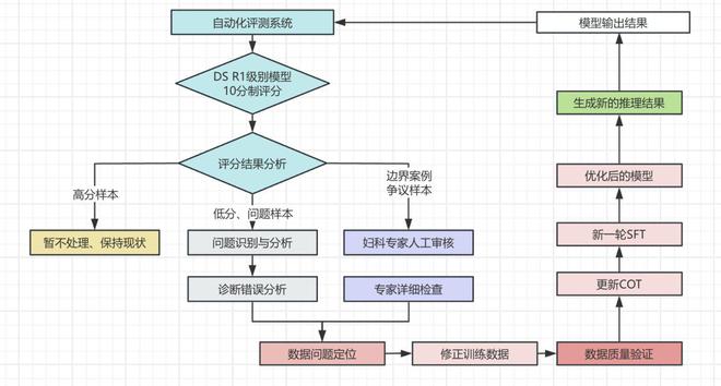 为补充自动化评测的不足,我们建立了严格的医生修正反馈机制。由内部妇科专家团队对模型输出进行人工审核,特别关注那些处于评分边界或存在争议的边缘案例。专家们会详细检查模型输出的诊断建议,将修正意见反馈到训练数据中,形成"评估-修正-优化"的闭环迭代机制。这个人机协同的评估体系既保证了评测效率,又确保了专业质量,为模型的持续优化提供了可靠保障。