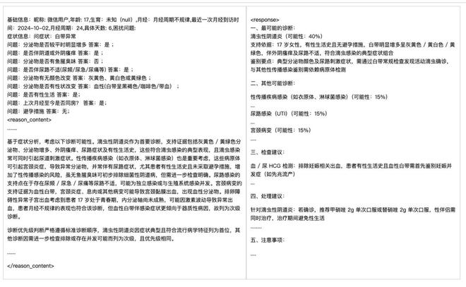 在医疗大模型的实际应用中,用户的问题往往零散且不完整,需要模型具备多维思考模式。医疗领域的容错率极低,大模型不仅要“说出知道的”,更要对依据不足或不确定的情况给出尽可能专业的诊断。豆蔻妇科大模型以真实临床路径为蓝本,在病例分析过程中不仅精准定位“滴虫性阴道炎”为首要诊断,还同步考虑性传播疾病、宫颈病变等多种鉴别诊断,并基于患者17岁青春期特征纳入“排卵障碍性出血”评估,形成多层级诊断网络。这种“全链路思维”在复杂症状场景中尤为凸显:当患者出现“灰黄色血性白带 + 尿频”复合症状时,模型通过逻辑链条解析,最终生成包含6项检查建议(白带常规、性传播疾病核酸检测等)及分层治疗方案(甲硝唑用药 + 性伴侣同治),从“疾病诊断”到“治疗方案”的临床全链路思考。这一过程对人力和医学专业能力要求极高。