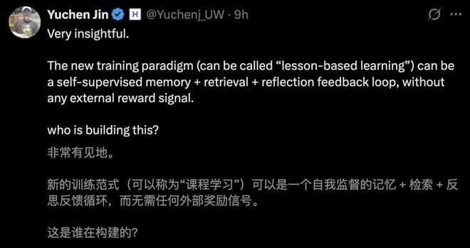 AI初创公司联创Yuchen Jin提出了一个有趣的观点,全新训练范式——课程学习,是一个自监督记忆+检索+反思的反馈循环,无需任何外部奖励信号。