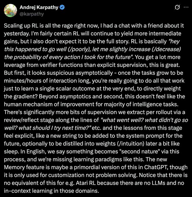 然而, 在Karpathy看来,从长远角度来讲,强化学习或许并不是最优策略。