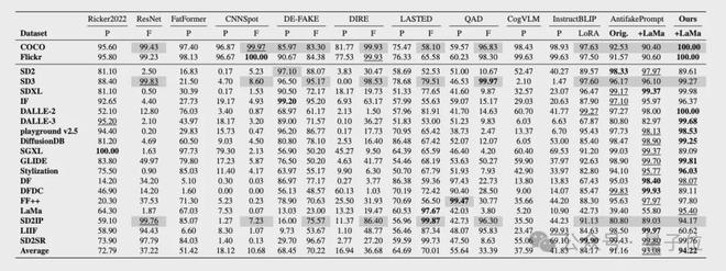 在检测能力评估上,参考现有方法,团队采用检测real/fake的准确率(Acc.)和平均精度(A.P.)作为核心指标。