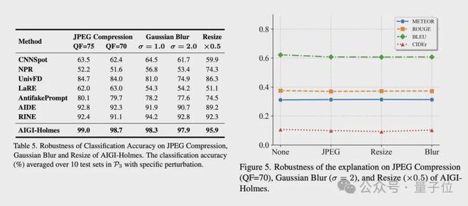 如表5(下图左侧)所示,在这些失真下,所有方法的性能显著下降。然而,AIGI-Holmes在这些挑战性场景中与其他基线方法相比,实现了更高的检测精度。