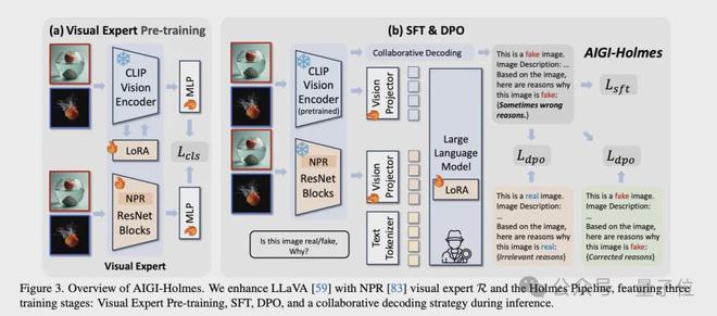 视觉专家预训练阶段:该阶段的核心目标是使MLLM的视觉编码器具备基础的AI生成图像检测能力。为此选择了两个视觉专家,分别是CLIP-ViT-L/14和NPR ResNet。其中CLIP用于检测high-level semantic缺陷,而NPR则用于检测low-level artfacts,分别在Holmes-set上进行LoRA微调和全参微调。通过二元交叉熵损失函数,模型能够迅速学习到真实图像与生成图像之间的差异,为后续的SFT和DPO阶段提供基础的视觉能力。