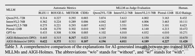 实验结果显示,基准测试方面,相比现有方法,团队的AIGI-Holmes在所有基准(benchamrk)上,均取得了最优效果。解释能力评估方面,团队在客观指标(BLEU/ROUGE/METEOR/CIDEr)以及大模型/人类主观评分上,相比当前先进大模型,均取得了最优效果。