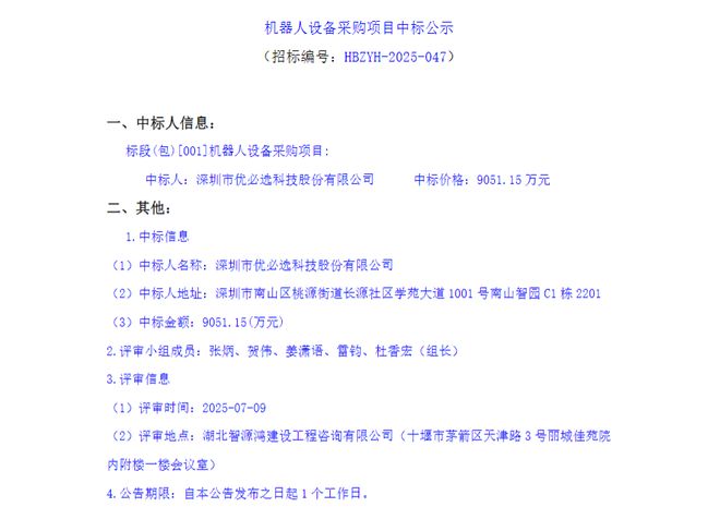 《机器人设备采购项目中标公示》显示,优必选此次中标机器人设备采购项目,合同金额为9051.15万元。