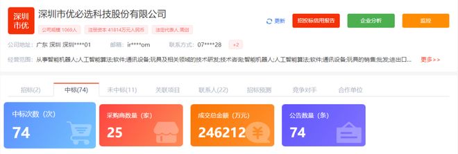 来源:中国招标投标公共服务平台这是优必选当前中标金额最大的项目。中国招标投标公共服务平台显示,目前,优必选中标74次,合计中标金额达2.46亿元。