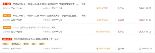 宇树科技已披露168项中标成交公告,金额在几万元至数百万元,此前中标项目以教育科研、工厂巡检等为主。