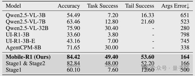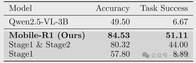 Stage 3的训练进一步增强了Mobile-R1的表现,其成功率比只有阶段1和阶段2训练的模型高出1.4点,这得益于任务级GRPO的有效应用。