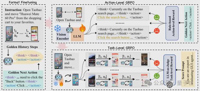 通过包括格式微调、动作级GRPO训练和任务级GRPO训练在内的三阶段训练过程,克服了以往方法仅依赖单一动作预测的局限性。