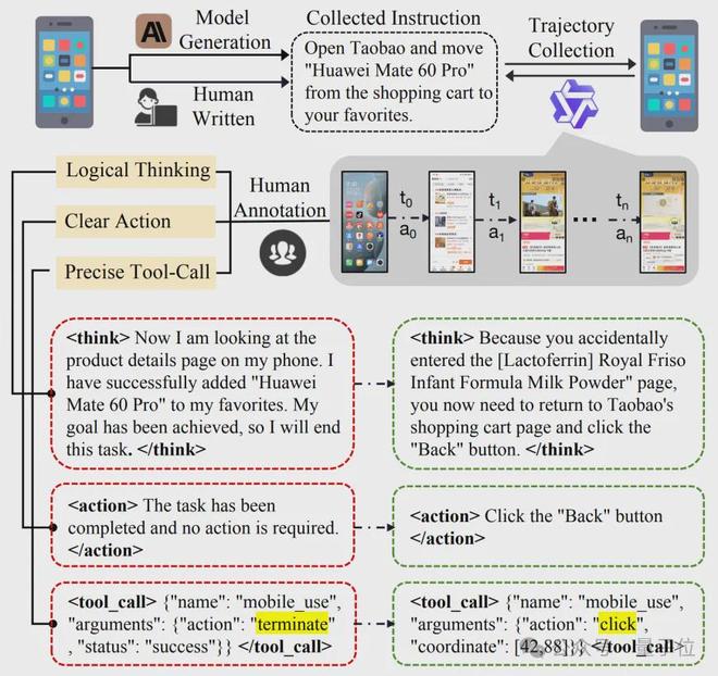 团队使用Qwen2.5-VL-3B执行一系列任务获得初始轨迹,并人工标注这些初始轨迹,得到了高质量的轨迹数据集。