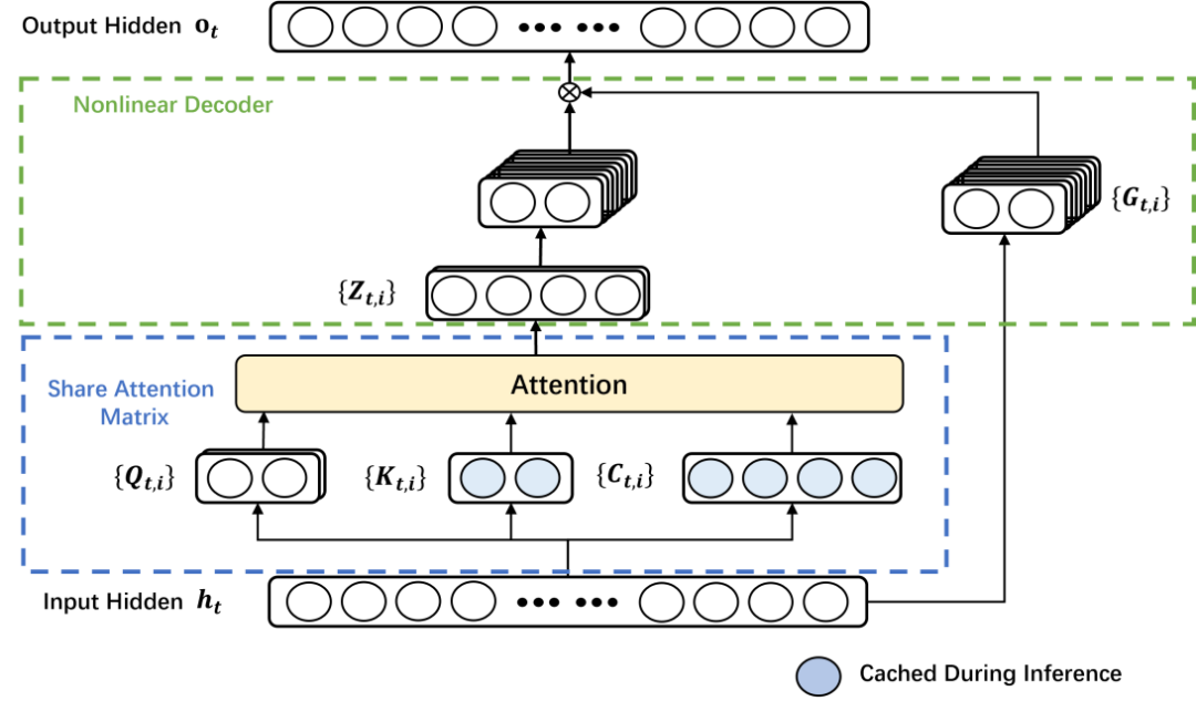 这项技术首先将所有注意力头的值向量高效地压缩为一个低维度的潜在表示 (Latent Representation),从而极大地减少了所需的存储空间。随后,通过一个轻量级且高效的 WaLU (Weighted additive Linear Unit) 非线性解码器,模型能够根据每一组注意力头的具体需求,从这个紧凑的潜在表示中动态地、定制化地生成所需的完整值向量。