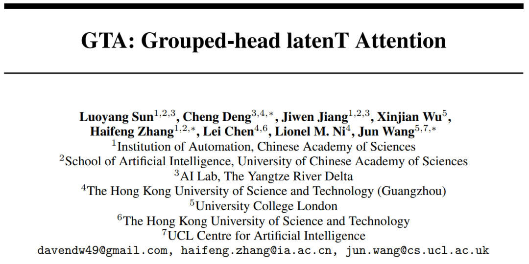 GTA 工作由中国科学院自动化研究所、伦敦大学学院及香港科技大学(广州)联合研发,提出了一种高效的大模型框架,显著提升模型性能与计算效率。一作为自动化所的孙罗洋博士生,研究方向为:大模型高效计算与优化,通讯作者为香港科技大学(广州)的邓程博士、自动化所张海峰教授及伦敦大学学院汪军教授。该成果为大模型的优化部署提供了创新解决方案。