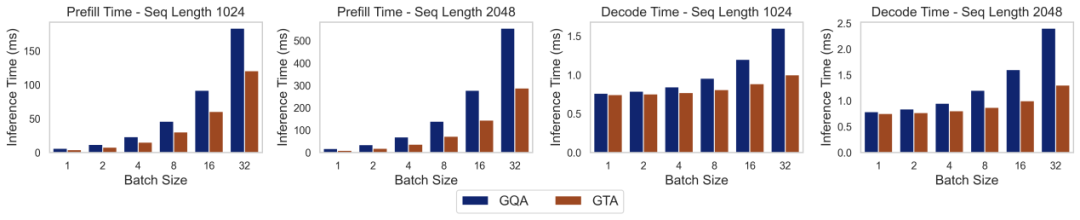 为了将理论优势转化为可量化的实际性能,研究团队利用 LLM-Viewer 框架,在配备 NVIDIA H100 80GB GPU 的高性能计算平台上,对 GTA-1B 和 GQA-1B 进行了全面的经验基准测试。下图清晰地展示了在不同配置下,两种模型的预填充和解码时间对比。从中可以明显看出,GTA-1B 在计算密集型的预填充阶段和 I/O 密集型的解码阶段都持续地优于 GQA-1B,充分展现了其卓越的延迟特性和更高的运行效率。