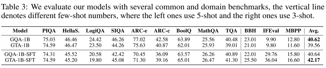 尽管 GTA-1B 在设计上采用了更小的缓存尺寸,但其损失轨迹却与 GQA-1B 高度匹配,这一事实有力地证明了 GTA 内存高效架构的有效性,即在减少资源消耗的同时不牺牲模型学习能力。在多项严苛的基准测试中,GTA-1B(包括经过 SFT 微调的版本)均展现出与 GQA-1B 相当甚至更为优异的性能,尤其在平均准确率上取得了显著提升。这充分表明,GTA 即使在资源受限的环境下,也能通过微调有效泛化到各种复杂任务,保持强大的竞争力。这些详尽的实验结果均已在下方的表格中呈现: