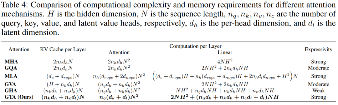 从理论层面分析,GTA 在计算复杂度和内存使用方面均实现了显著的效率提升。其 KV 缓存尺寸从 MHA 的