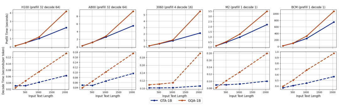 上图直观地展示了在不同配置下,GTA-1B 与 GQA-1B 的预填充和解码时间对比。GTA-1B(蓝色实线)在所有测试平台上都持续展现出优于 GQA-1B(橙色虚线)的预填充时间,尤其是在处理 2k token 等更长输入序列时,性能差距更为显著,体现了其在处理长文本时的强大优势。在解码阶段,GTA-1B 同样表现出卓越的性能,特别是在扩展生成长度时,这种优势在所有硬件类型上都保持一致,充分突显了其设计的鲁棒性。