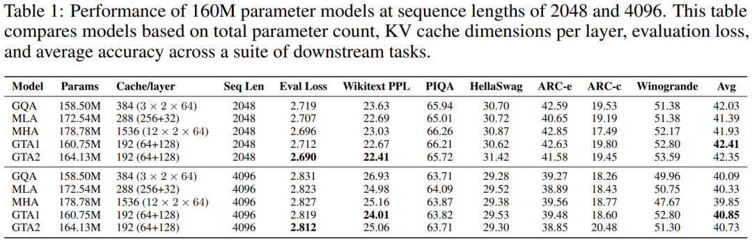 在针对 160M 参数规模模型的测试中,无论输入序列长度是 2048 还是 4096 个 token,GTA 都持续展现出卓越的性能优势。具体而言,采用 GTA2 配置的模型在 2048 token 序列长度下,成功实现了比传统 MHA、GQA 和 MLA 更低的评估损失,并获得了更优异的 Wikitext 困惑度(PPL)表现。此外,GTA1 配置的模型在多项下游任务中取得了更高的平均准确率,彰显了其在实际应用中的有效性。尤为值得强调的是,GTA 在内存效率方面表现出类拔萃,其每层所需的 KV 缓存大小仅为 MHA 的 12.5%(具体数据为 192 维度对比 MHA 的 1536 维度),这一显著的缩减充分突显了 GTA 在内存优化方面的强大能力。实验结果详细呈现在下方的表格中: