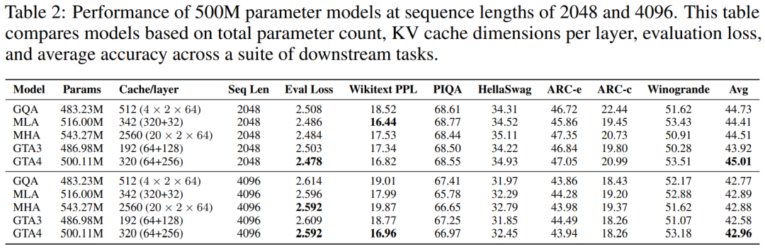 将模型规模扩展至 500M 参数时,GTA 依然保持了其在性能上的领先地位。在 2048 token 序列长度的测试中,GTA 不仅实现了更低的评估损失,还在下游任务中取得了更高的平均准确率,同时其 Wikitext 困惑度与 MHA 和 GQA 等主流模型保持在同等甚至更优的水平。GTA 持续展现出其独有的内存优势,其 KV 缓存大小仅为 MHA 的 12.5%(具体为 320 维度对比 MHA 的 2560 维度),即使在采用更小缓存(例如 192 维度,仅为 MHA 的 7.5%)的情况下,GTA 也能获得可比拟的性能表现,充分印证了其在内存效率与性能之间取得的完美平衡。在处理 4096 token 长序列的任务中,GTA 不仅能够与 MHA 的评估损失持平,更在 Wikitext 困惑度和下游任务的平均准确率上提供了更优异的表现。这些详尽的实验数据均已在下方的表格中列出: