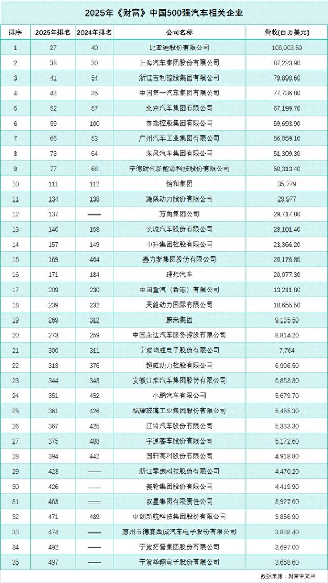 2025年《财富》中国500强排行榜对外发布,该榜单采用与《财富》世界500强一脉相承的制榜方法,以2024年营业收入为基准,同时包括了上市和非上市企业。具体到汽车领域,整车企业共有18家上榜,汽车零部件企业有15家,另外还有中升、永达两家汽车零售领域企业上榜。其中,比亚迪排名最为靠前,位于第27位;赛力斯则是今年榜单上排位跃升幅度最大的,位居第169位,排名较去年上升235个位次。动力电池头部企业宁德时代的排名较去年下降9个位次,位列第77位,但净利润领先于其他整车及零部件企业。