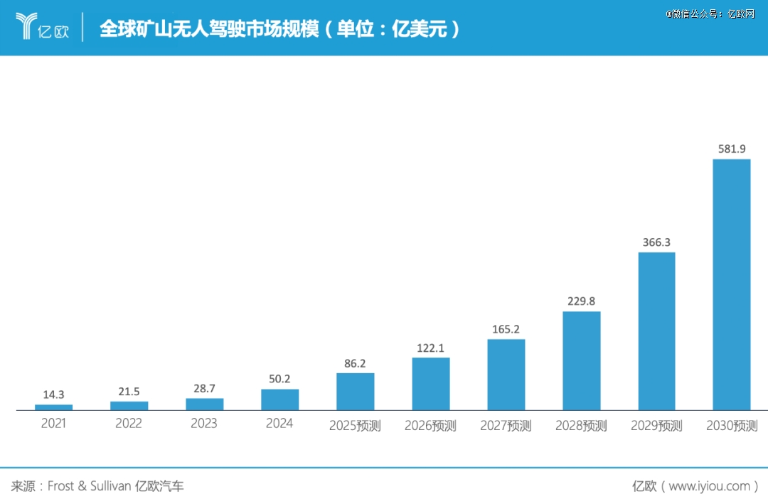 根据全球咨询机构Frost & Sullivan的预测,从2024年到2030年,全球矿山无人驾驶解决方案的市场规模将从7亿美元增长至超81亿美元,约合人民币近600亿元。