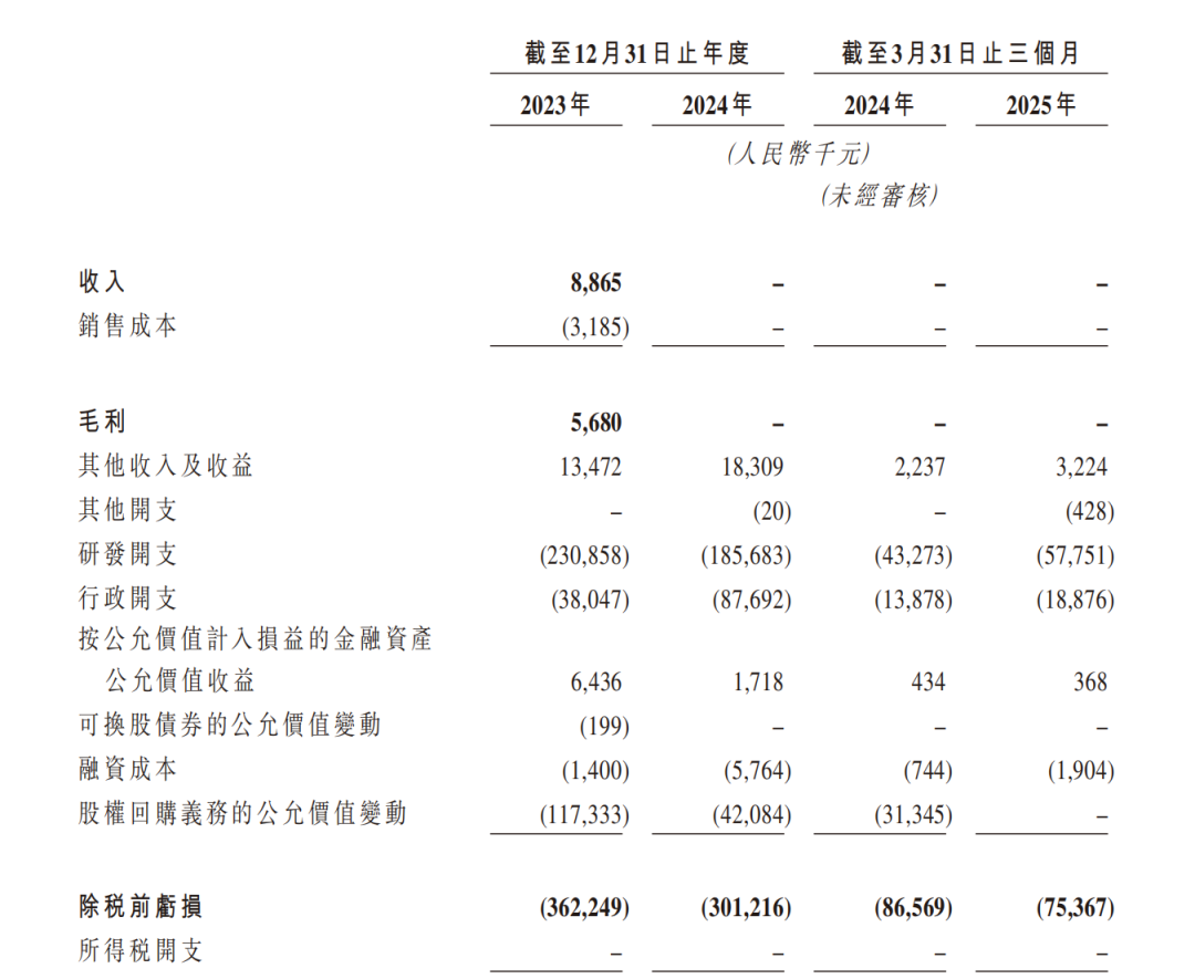 财务数据显示,维立志博仅在2023年实现收入886.5万元。2023年、2024年及2025年前三个月,公司净亏损分别为3.62亿元、3.01亿元和7536.7万元。同期,公司研发开支分别为2.31亿元、1.86亿元、5775.1万元,高额的研发投入是亏损的主要原因之一。