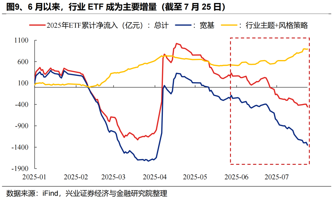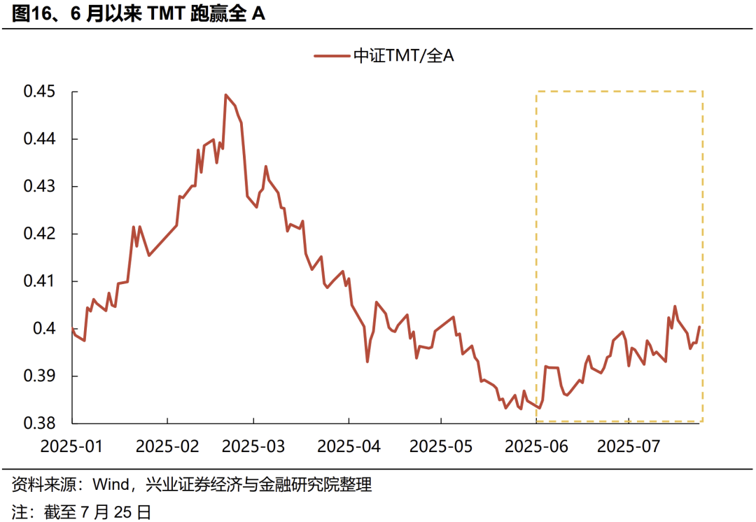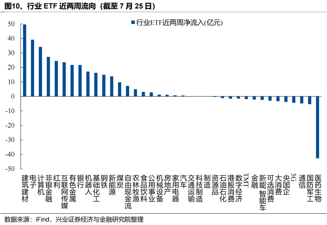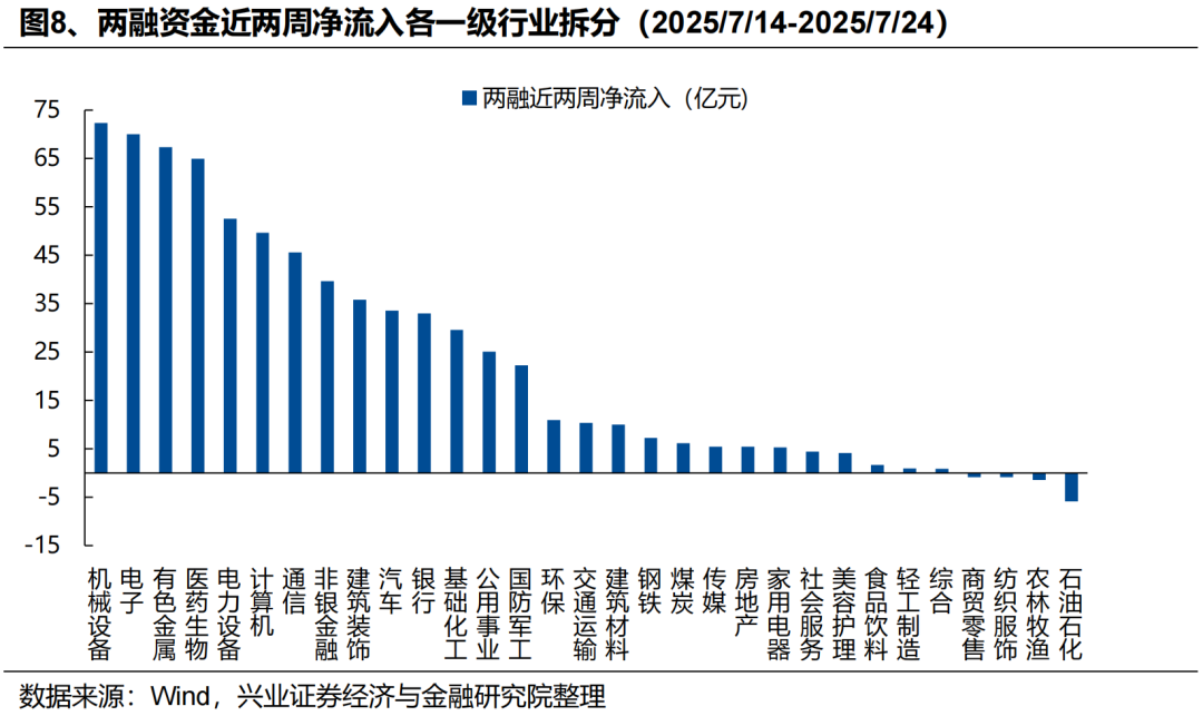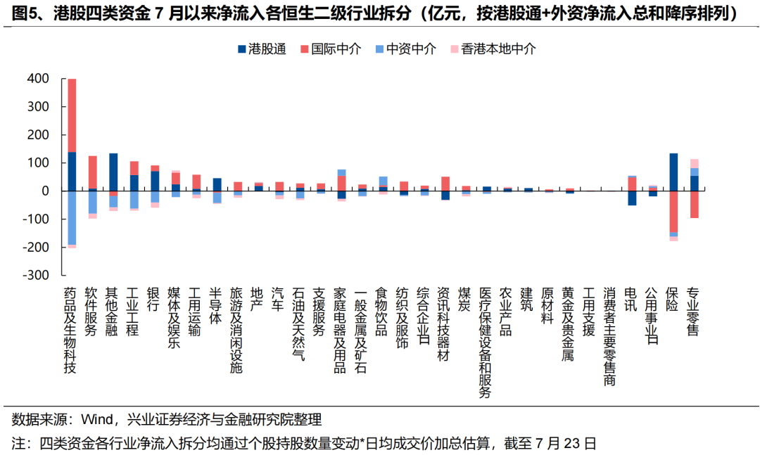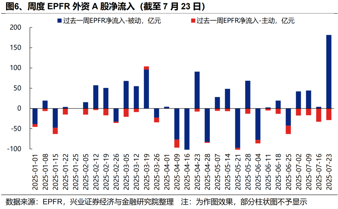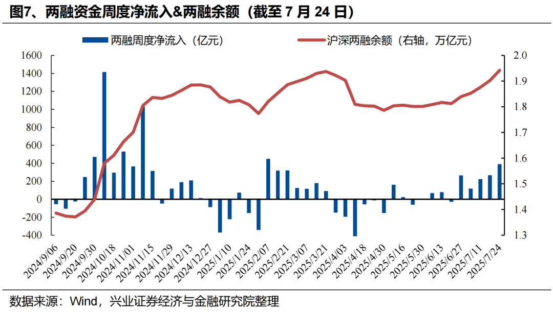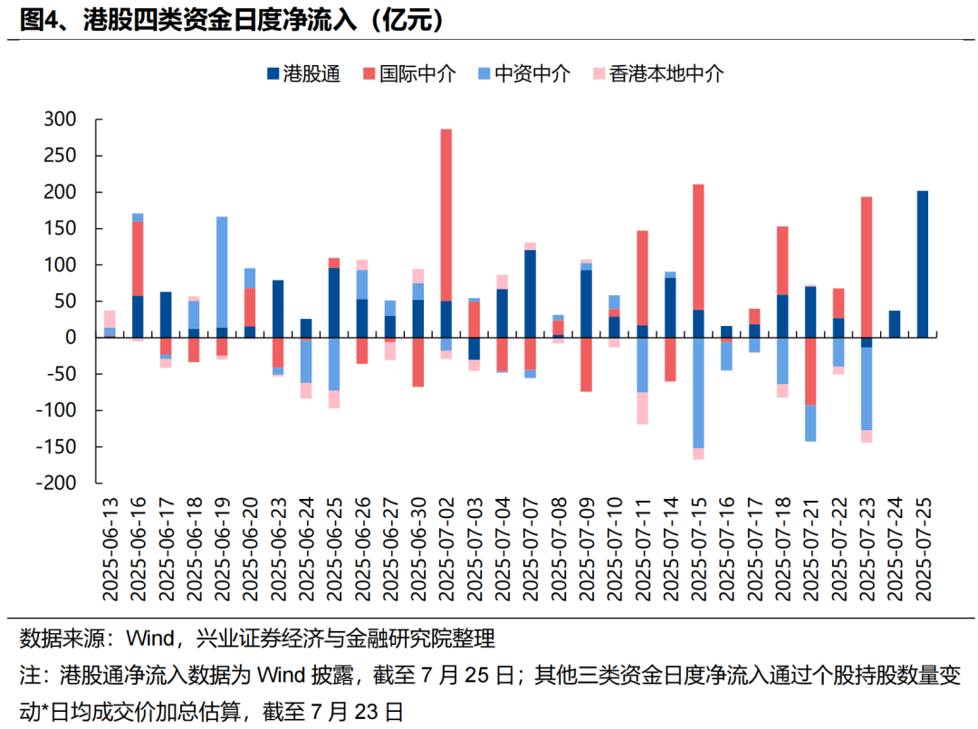 外资:近期外资流入港股意愿持续升温,积极配置医药、互联网、周期等板块,同时被动外资已在大幅回补A股仓位。一方面,7月以来外资流入港股意愿持续提升,据我们测算,7月以来(截至7月23日)国际中介净流入港股超644亿元,同期港股通净流入649亿元,外资流入规模已与南下资金相当。结构上,外资主要流入医药、软件服务、媒体娱乐、资讯科技器材、电讯等科技板块,同时“反内卷”政策驱动下,外资对工业工程(主要是宁德时代)、汽车、金属、煤炭等行业的关注度也在升温。另一方面,7月以来被动外资逐渐回补A股仓位,7/17-7/23更是净流入超180亿元,创去年10/11以来周度新高。