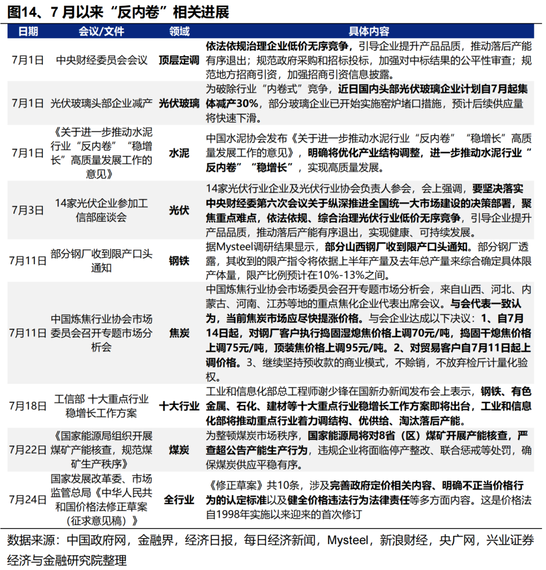 一方面,政策对于“反内卷”的决心不宜低估。此前市场预期本轮“反内卷”主要以行业自律为主,但可以看到近期国家层面已在出台各类政策,自上而下推动“反内卷”实施。7月以来,不仅有光伏、水泥、钢铁、焦炭等行业已经开始有减产、提价等实质性动作,7月18日工信部“钢铁、有色、石化、建材等十大重点行业稳增长工作方案即将出台”、7月22日国家能源局下场整治煤炭超产、7月24日发改委和市场监管总局就《价格法修正草案》公开征求意见,正在表明国家对于本轮“反内卷”的决心,资源品供给侧收缩的预期进一步强化。作为本轮最重要的政策主线之一,7月政治局会议有望对此作进一步部署。