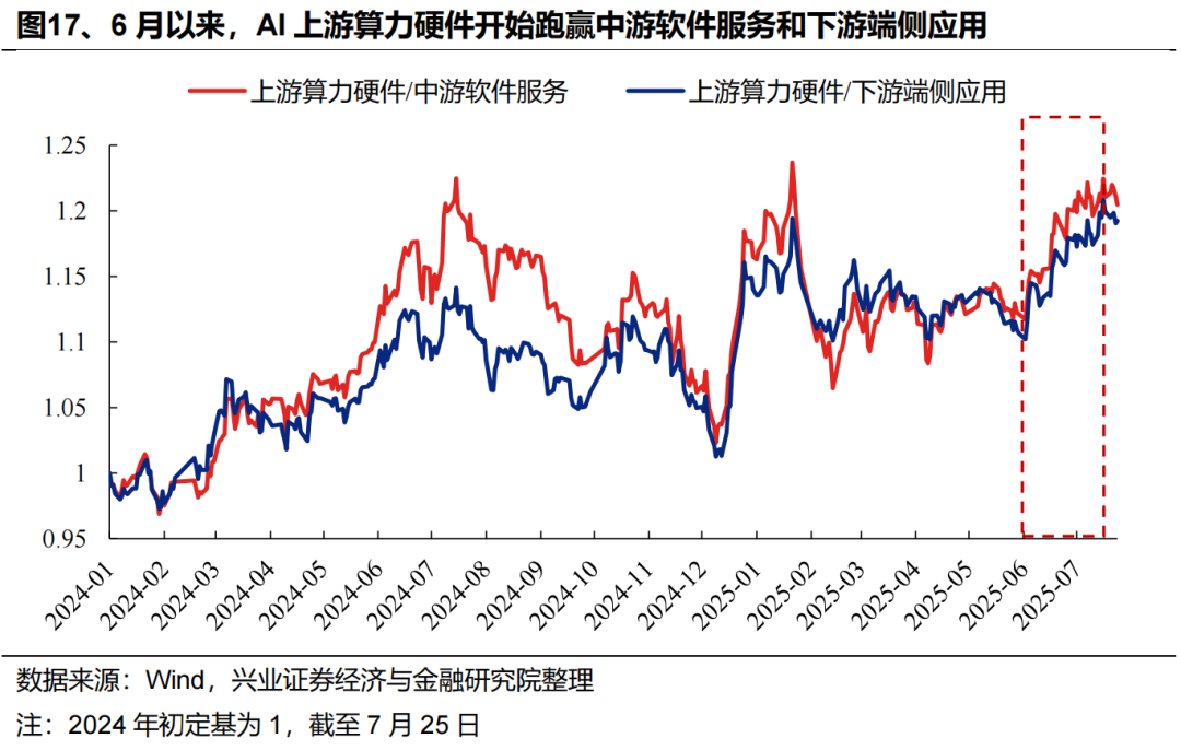 但我们观察到,尽管6月以来AI板块整体修复,但内部却出现两个明显的分化。一方面,以PCB、光模块为代表的上游算力硬件开始跑赢中游软件服务&下游端侧应用;另一方面,上游算力硬件内部,以光模块、PCB为代表的北美算力链大幅跑赢国产算力链。