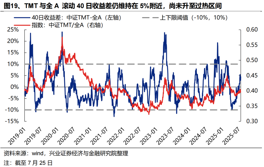滚动收益差看,随着近期市场整体上涨,TMT与全A滚动40日收益差仍维持在5%附近,尚未升至10%以上的过热区间。