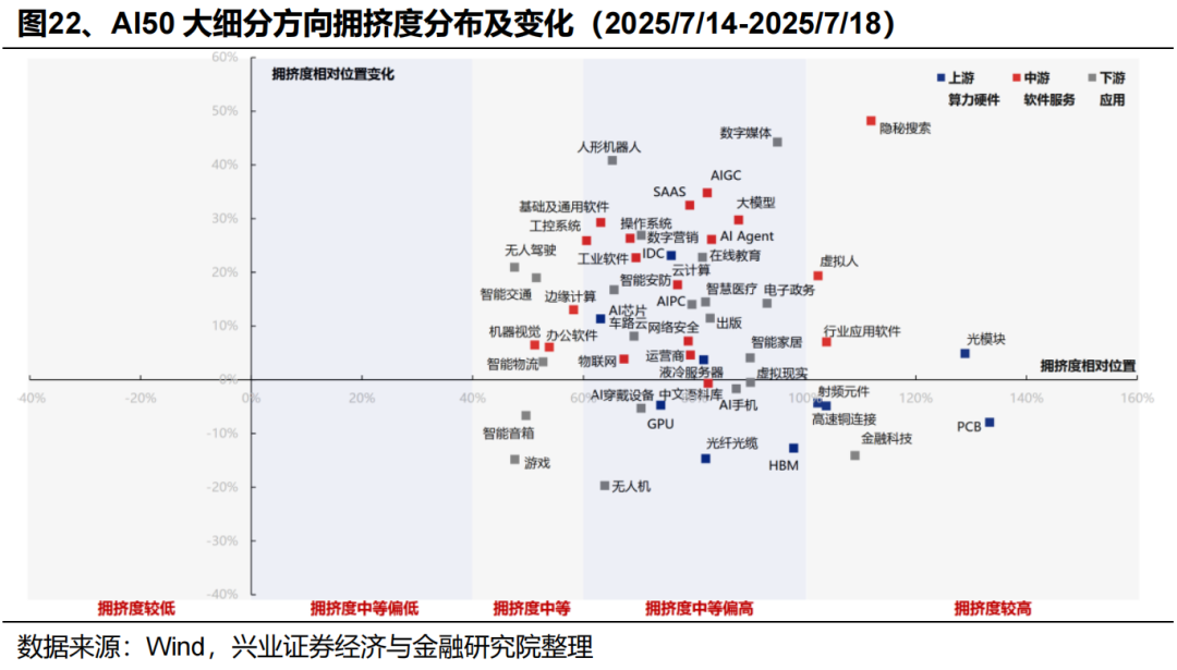 从AI50大细分方向的拥挤度上看,当前多数领域拥挤度仍处于偏中等水平,包括上游算力(AI芯片、IDC、GPU、液冷服务器)、中游软件服务(办公软件、基础及通用软件、操作系统、工业软件、SASS、AIAgent等)、下游应用(无人驾驶、游戏、人形机器人、智慧医疗等)。