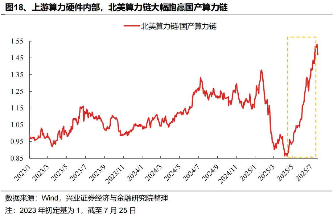 国产算力方面,国内互联网厂商资本开支增长仍是长期趋势,随着近期H20芯片限制再度放开,叠加三季度英伟达对华新卡B30有望完成市场导入,前期市场对互联网厂商的资本开支担忧有望持续减弱,叠加下半年燧原科技、壁仞科技等国产芯片企业有望上市的催化,国产替代逻辑下产业链确定性仍强。