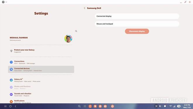 其中最值得关注的改进,就是连接到外部显示器后,设置中移除了专用的 DeX 标签(被“已连接显示器”菜单取代),同时“退出 DeX”按钮也从应用抽屉中消失。应用抽屉现在可以垂直滚动,任务栏也会显示手机上停靠的应用。