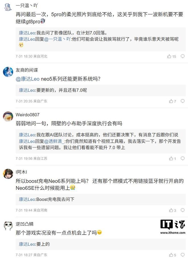 IT之家注意到,realme UI 产品经理 @康达Leo 还回复了部分用户的问题:针对 5 Pro 机型是否会支持柔光照片,他回复“我去问了影像团队,在计划 7.0 回落”;针对 Neo5 系列机型是否还能更新系统,他表示“要更新的,并且还有 7.0 呢”。